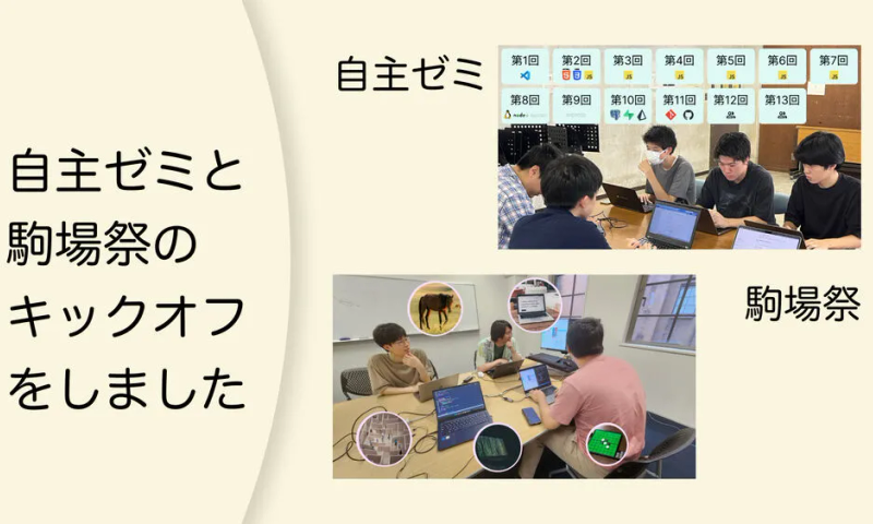 ut.code();では、8月4日に、2024年度のAセメスターに開講する自主ゼミの運営のキックオフミーティングと第75回駒場祭で出展する企画のキックオフミーティングを行いました。 自主ゼミのキックオフミーティング 自主ゼミのキックオフミーティングの様子 13時30分から15時に自主ゼミのキックオフミーティングを行いました。 2024年度のAセメスターに開講する予定の自主ゼミは、2024年度のSセメスターに開講した全ゼミと同様に、Webプログラミングを基礎から学び、Webプログラミングに必要な技術を一通り学ぶことができる講義となっています。 ut.code();が独自に開発した教材で...